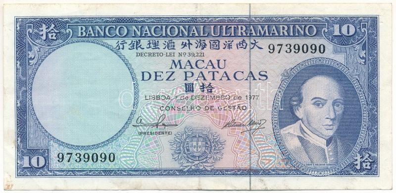 Macau 1977. 10 Patacas C:F stron... https://www.darabanth.com/hu/472-Gyorsarveres/472.0/Numizmatika/Kulfoldi-bankjegyek~2000016/Makao-1977-10P-TF-eros-papir-folt-Macau-1977-10-Patacas-CF-strong-paper-spotted-Krause-P23~II3199641