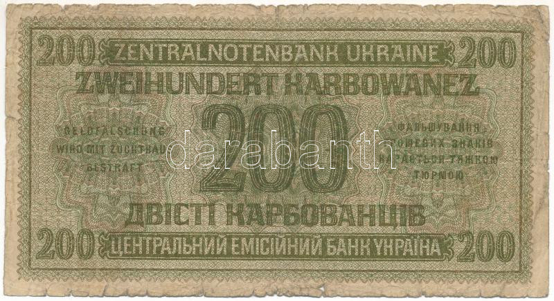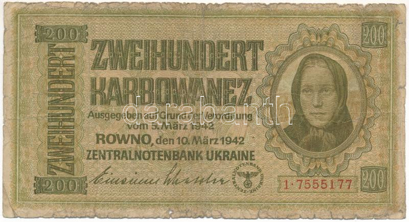 Ukrajna / Német megszállás 1942. 200K T:VG Ukraine / German occupation... https://www.darabanth.com/hu/472-Gyorsarveres/472.0/Numizmatika/Kulfoldi-bankjegyek~2000016/Ukrajna-Nemet-megszallas-1942-200K-TVG-Ukraine-German-occupation-1942-200-Karbowanez-CVG~II3195921