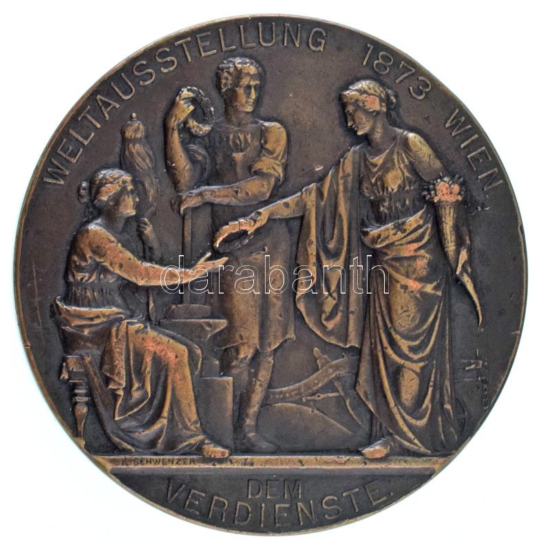 Austria 1873. "The Vienna World Exhibition / Merit" commemorative bronze medallion. Sign.: Joseph Tautenhayn / Karl Schwenzer (67mm) C:XF scratch, small edge error, ding