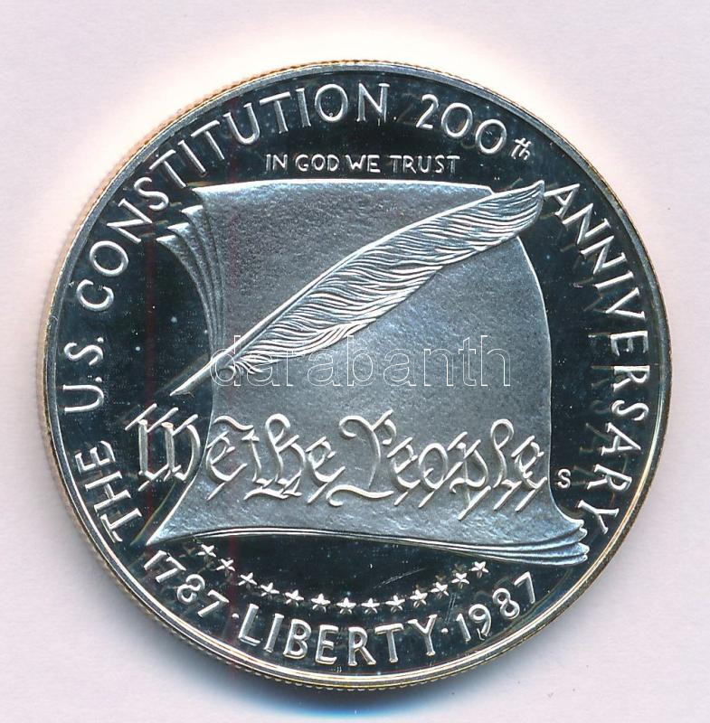 Amerikai Egyesült Államok 1987S 1$ Ag "Az Egyesült Államok Alkotmányának 200. évfordulója" kapszulában, tanúsítvánnyal T:PP patina USA 1987S 1 Dollar Ag "200th Anniversary of the Constitution" in capsule, with certificate C:PP patina Krause KM#220