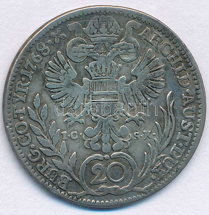 Ausztria 1768IC-SK 20kr Ag "Mária Terézia" T:VF,F patina, ka... https://www.darabanth.com/hu/472-Gyorsarveres/472.0/Numizmatika/Kulfoldi-fem-es-ezustpenzek~2000017/Ausztria-1768IC-SK-20kr-Ag-Maria-Terezia-TVF-F-patina-karc-Austria-1768IC-SK-20-Kreuzer-Ag-M~II3194221