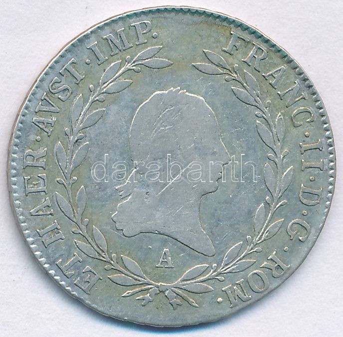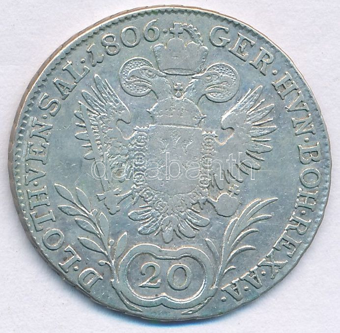 Austria 18... https://www.darabanth.com/hu/472-Gyorsarveres/472.0/Numizmatika/Kulfoldi-fem-es-ezustpenzek~2000017/Ausztria-1806A-20kr-Ag-I-Ferenc-TVF-F-patina-Austria-1806A-20-Kreuzer-Ag-Franz-I-CVF-F-patin~II3194272