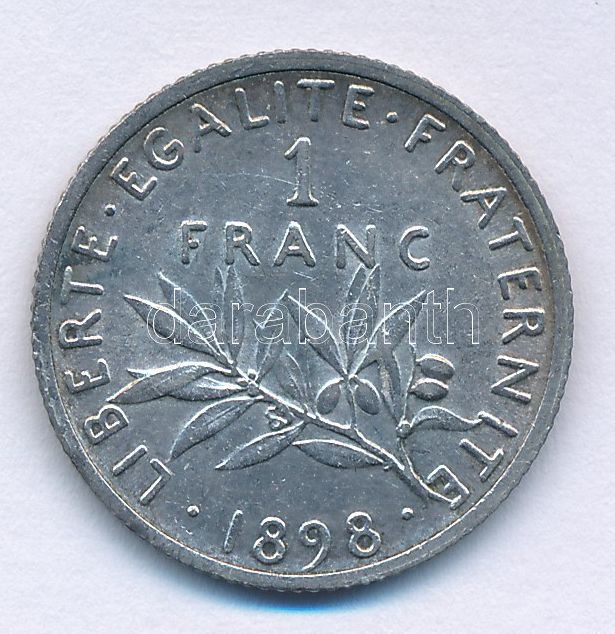 Kraus... https://www.darabanth.com/hu/472-Gyorsarveres/472.0/Numizmatika/Kulfoldi-fem-es-ezustpenzek~2000017/Franciaorszag-1898-1Fr-Ag-TVF--France-1898-1-Franc-Ag-CVF--Krause-KM23844~II3196111