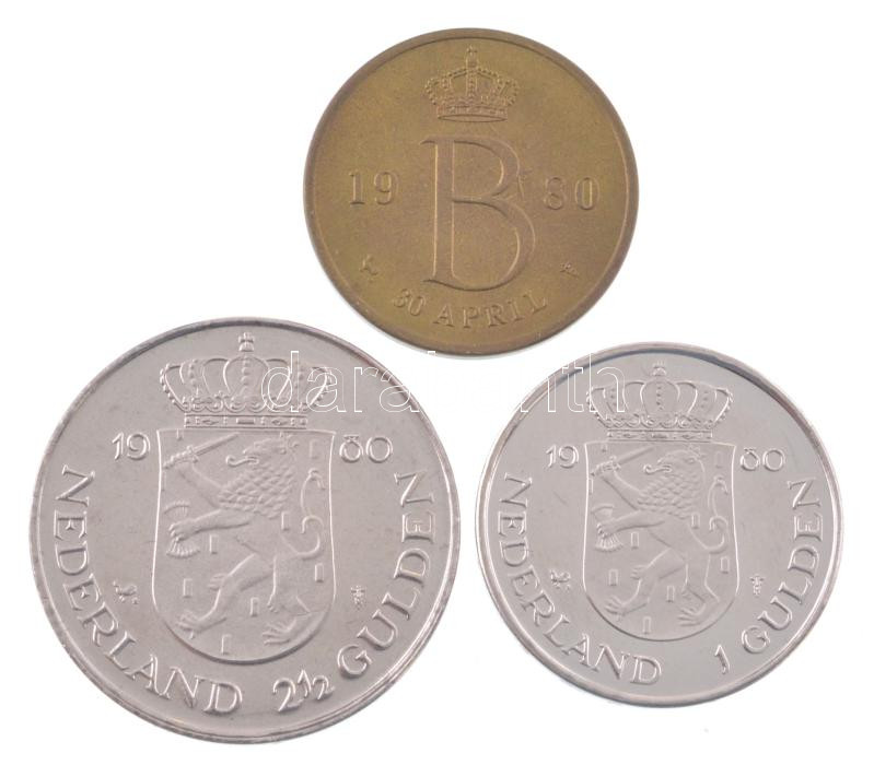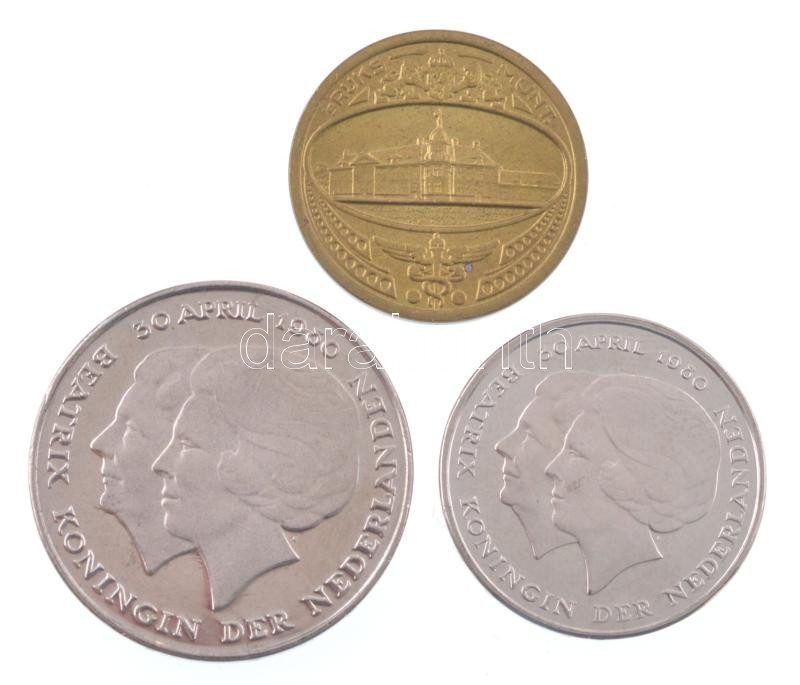 Hollandia 1980. 1G Ni "Beatrix beiktatása" + 2 1/2G Ni "Beatrix beiktatása" + pénzverdei koronázási emlékzseton (23mm) együtt, sérült dísztokban T:AU
