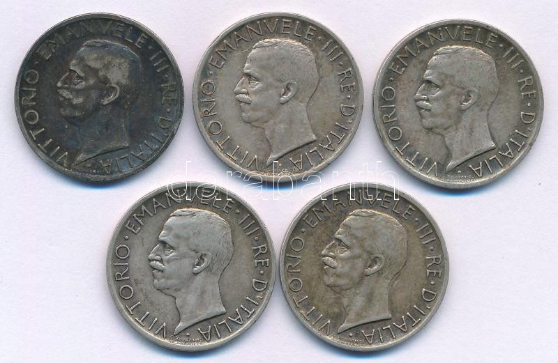 Leírás: Olaszország 1927R 5L Ag "III. Viktor Emánuel" (5x) T:XF,VF patina, ph. Italy 1927R 5 Lire Ag "Vittorio Emanuele III" (5x) C:XF,VF patina, , edge error Krause KM#67.1