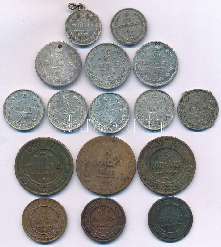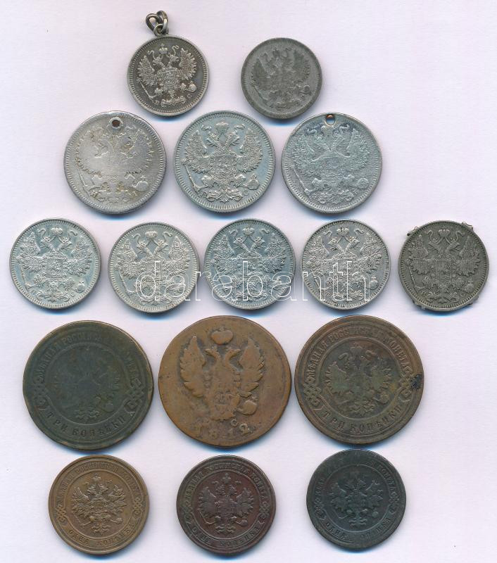 Orosz Birodalom 1812-1915. 16db-os kopejka tétel, közte 1812. 2k Cu + 1899-1905. 3k Cu (2xklf) + 1897-1914. 1k Cu (3xklf) + 1904-1915. 10k Ag (2xklf) + 1913-1914. 15k Ag (5db/2xklf) + 1868-1914. 20k Ag (3xklf) T:AU-F közte lyukasztott, fülnyom, füllel