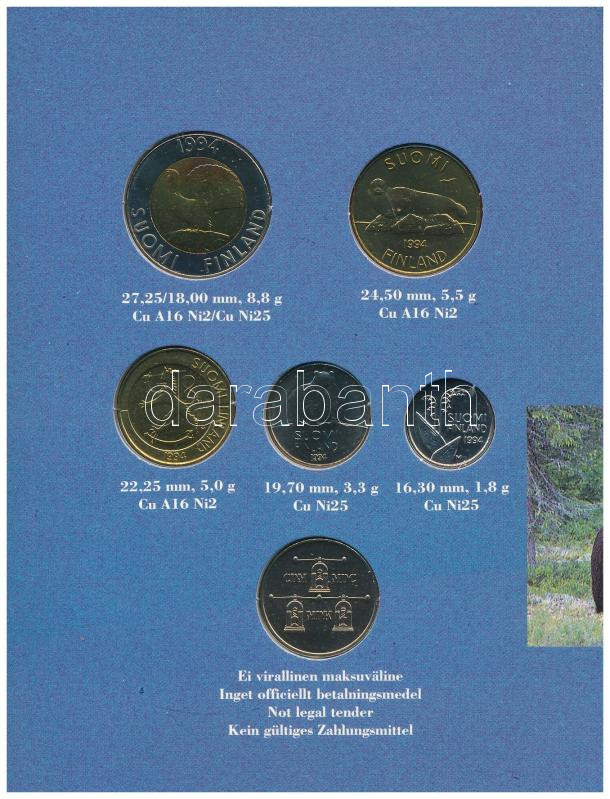 Leírás: Finnország 1994. 10p - 10M (5xklf) forgalmi sor + "Finn verde" zseton szettben, karton dísztokban T:UNC