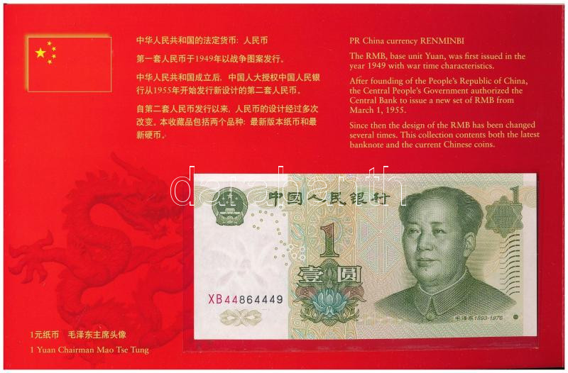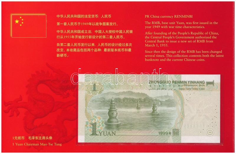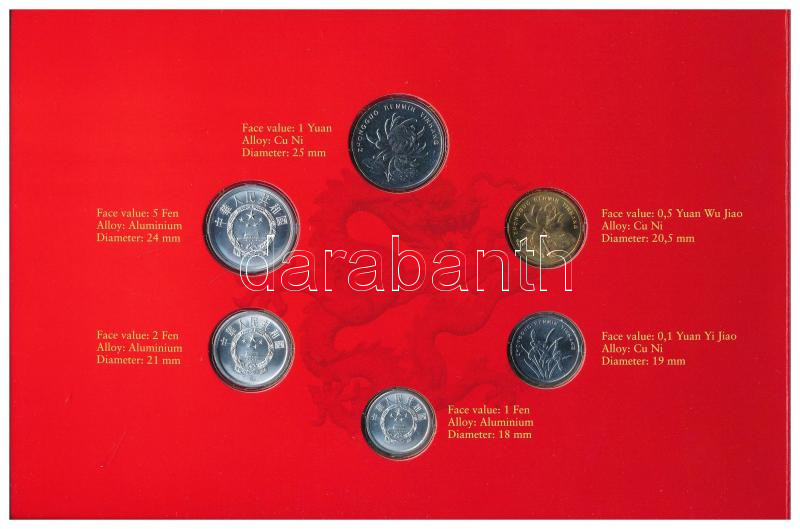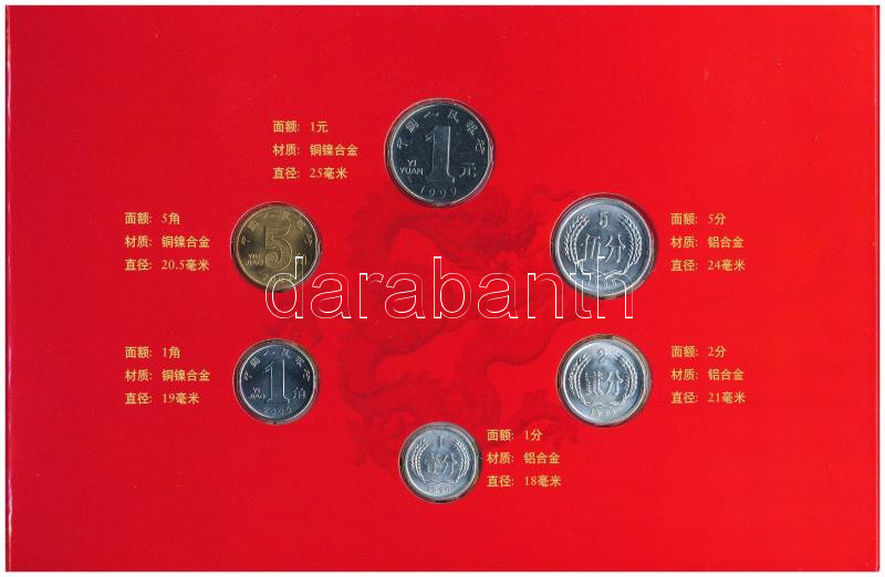 Leírás: Kína 1986-2005. 1f-1Y (6xklf) forgalmi összeállítás + 1999. 1Y bankjegy, karton díszcsomagolásban T:UNC,UNC