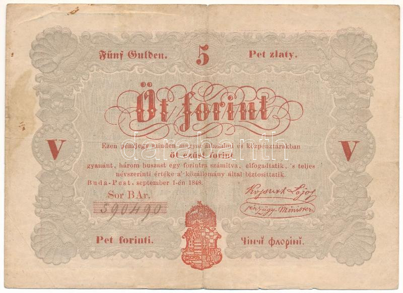 Leírás: 1848. 5Ft "Kossuth bankó" vörösesbarna nyomat T:F folt, szakadás, amúgy erős papír Adamo G109