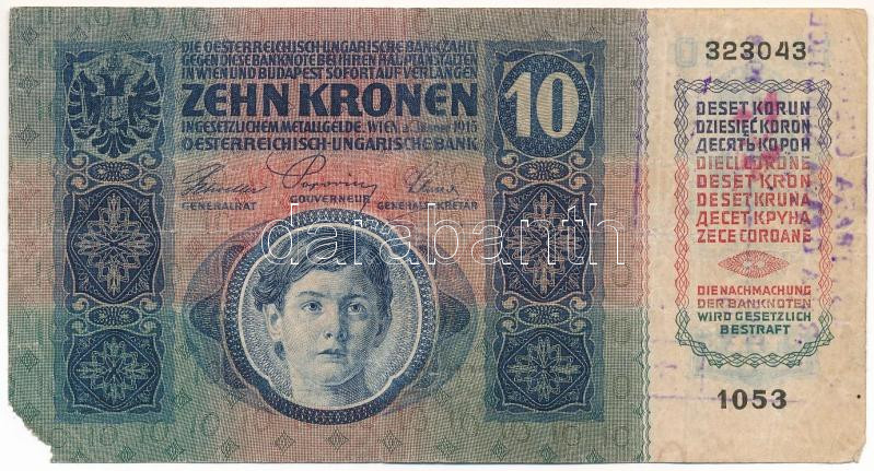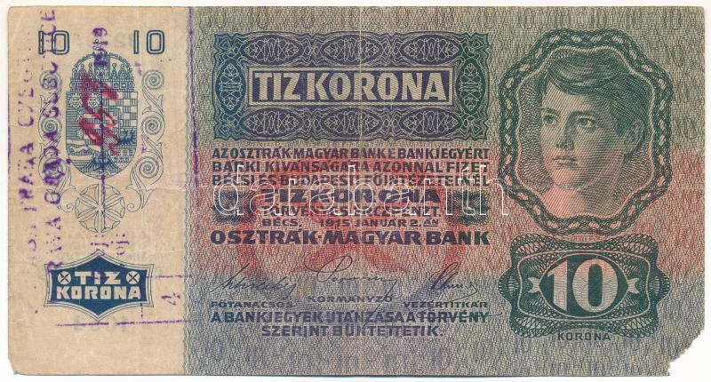 Leírás: 1915. 10K hamis jugoszláv felülbélyegzéssel, piros kézi "257" sorszámmal T:VG az egyik saroknál anyaghiány