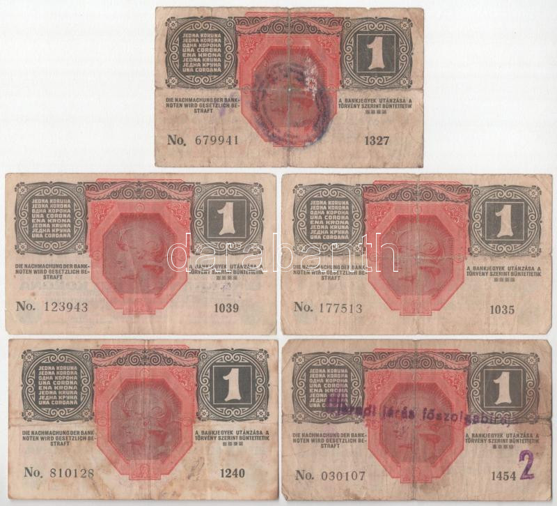 1916. 1K (5x) különböző hamis felülbélyegzésekkel T:VG https://www.darabanth.com/hu/472-Gyorsarveres/472.0/Numizmatika/Magyar-bankjegyek~2000008/1916-1K-5x-kulonbozo-hamis-felulbelyegzesekkel-TVG~II3200193