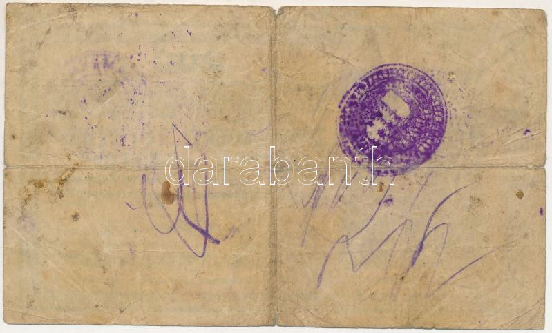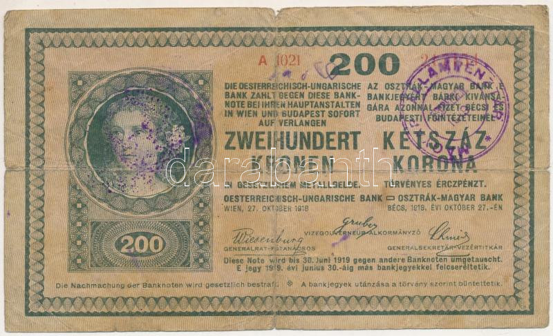 Leírás: 1918. 200K "1021" sima hátlappal, hamis "Magyar Állampénztár" felülbélyegzéssel T:VG folt, kis szakadás, anyaghiány