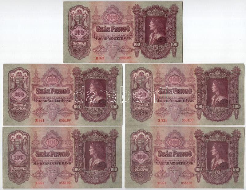 Leírás: 1930. 100P (5x) sorszámkövetők "E 921 055187 - E 921 055191" T:VF Adamo P17