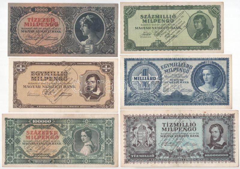 1946. 10.000MP-1.000.000.000MP (6xklf) mind "Bélyeg- és Pénzkiállítás a Pengő bevezetésének 70. és a Forint 50 éves jubileuma alkalmából - Salgótarján, 1996. X. 14-25." felülbélyegzéssel T:F közte szép papír