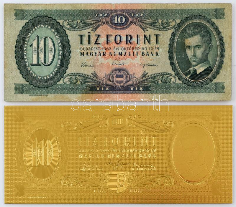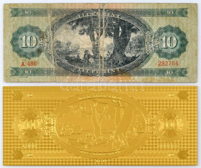 Leírás: 1962. 10Ft "A 486 282784" + 1947. 10Ft aranyozott bankjegy replika T:VG folt, replika :UNC