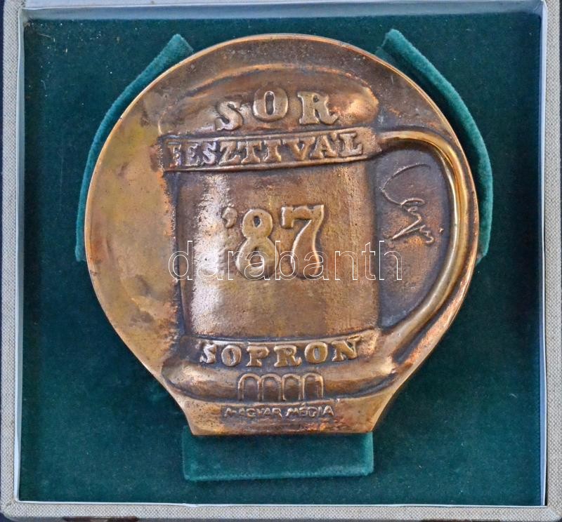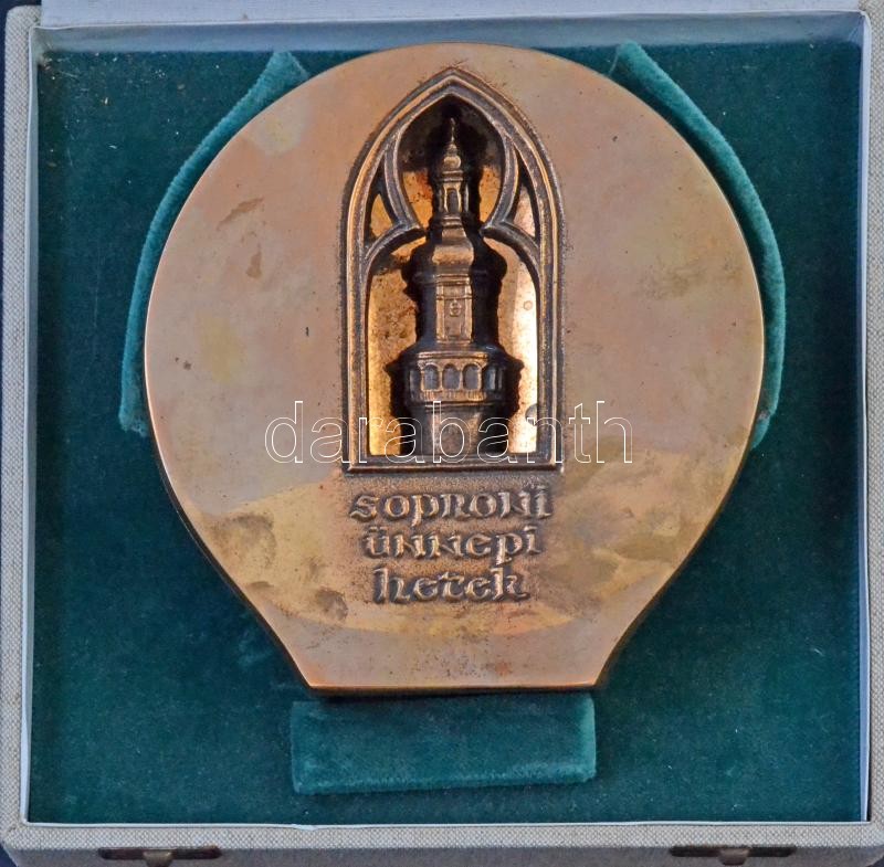 Lapis András (1942-) 1987. "Soproni Ünnepi Hetek / Sör Fesztivál - '87 Sopron - Magyar Média" ablakos kialakítású két darabból álló a Tűztornyot ábrázoló öntött Br plakett. Eredetileg a fesztivál első helyezettjének szánt díjplakett, végül átadására nem került sor. Összesen három példányban készült, ezek közül egyet az eseményen gravíroztak, a tételben szereplő darab gravírozatlan. Eredeti dísztokban. (151x146mm) T:1 RRR!