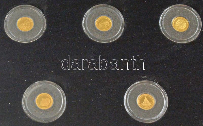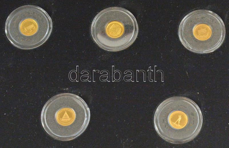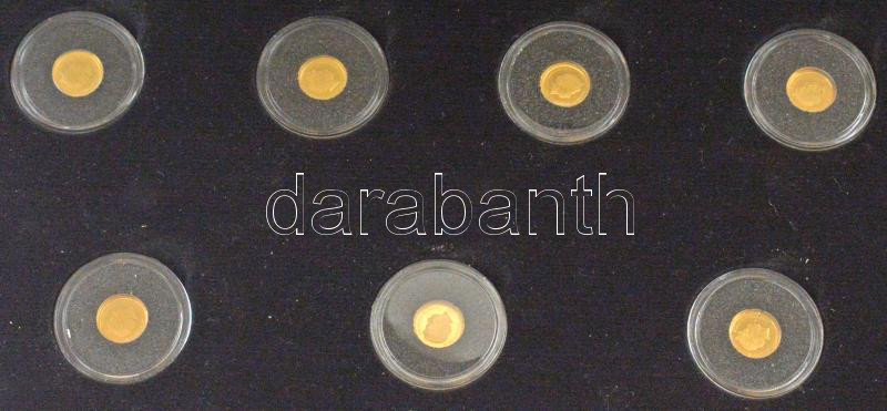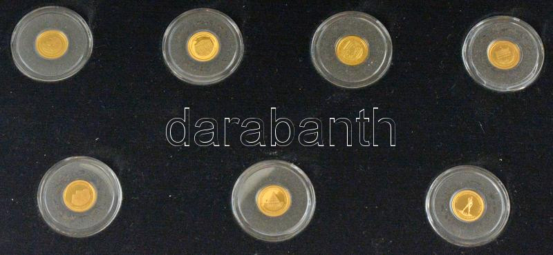 Salamon-szigetek 2013. 1$ Au "Az ókori világ hét csodája" (7xklf, teljes szett), elegáns mahagóni fa éremtartóban, tanúsítványokkal és nagyítóval (7x0.5g/0.585/11mm) T:PP Solomon Islands 2013. 1 Dollar Au "Seven Wonders of the Ancient World" (7xdiff, full set) in original wood case, with certificates and magnifying glass (7x0.5g/0.585/11mm) C:PP