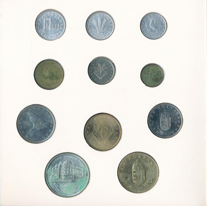 Leírás: 1993. 10f-200Ft (11xklf) forgalmi sor, háromlapos verzió, "Magyarország pénzérméi" karton dísztokban, benne 200Ft Ag "MNB" T:BU patina Adamo FO26