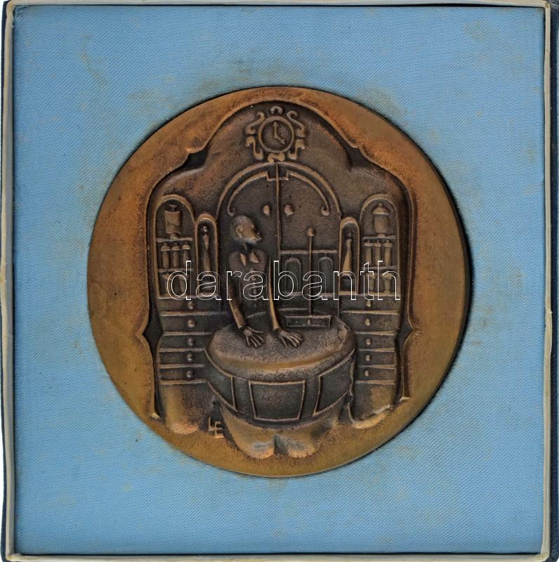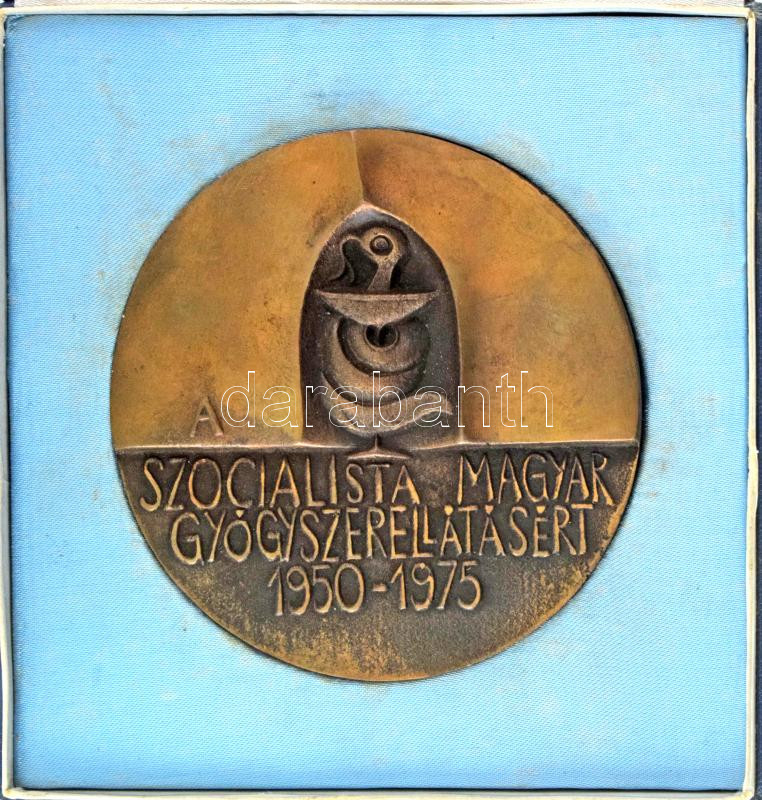 Leírás: Ligeti Erika (1934-2004) 1975. "A Szocialista Magyar Gyógyszerellátásért 1950-1975" kétoldalas bronz plakett, eredeti dísztokban (97mm) T:AU