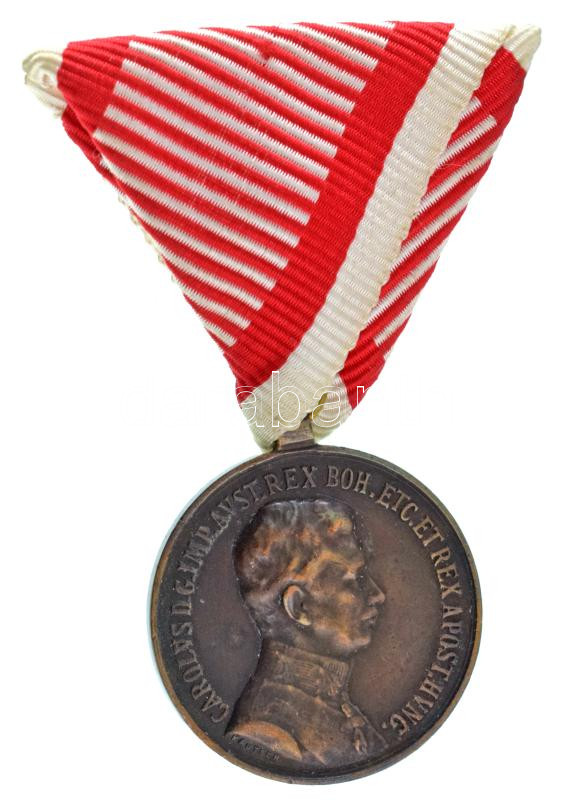 Leírás: 1917. "Károly Bronz Vitézségi Érem" bronz kitüntetés modern mellszalagon. Szign.: Kautsch T:XF