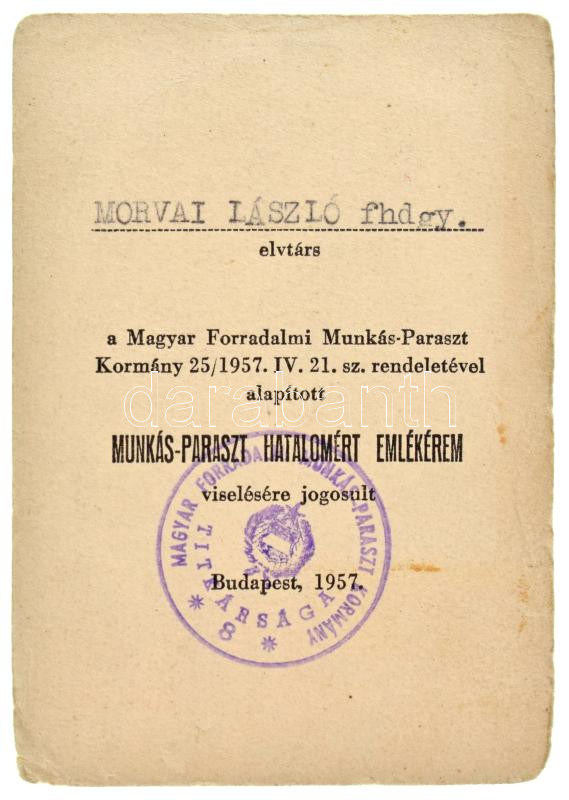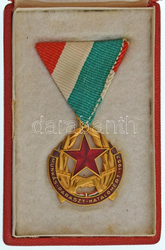Leírás: 1957. "Munkás-Paraszt Hatalomért Emlékérem" aranyozott, zománcozott bronz kitüntetés mellszalagon, eredeti tokban, adományozói okirattal T:AU NMK 700.