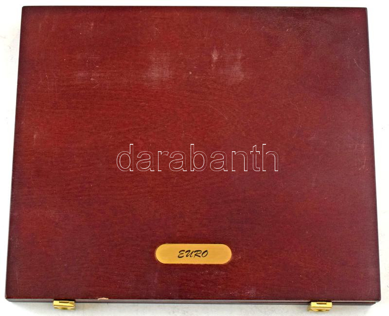 Leírás: Faborítású éremtartó kazetta (~270x230mm), 12 férőhellyel (54x54mm átmérőjű fészkekkel), "EURO" sárgaréz táblával. Használt, de jó állapotban