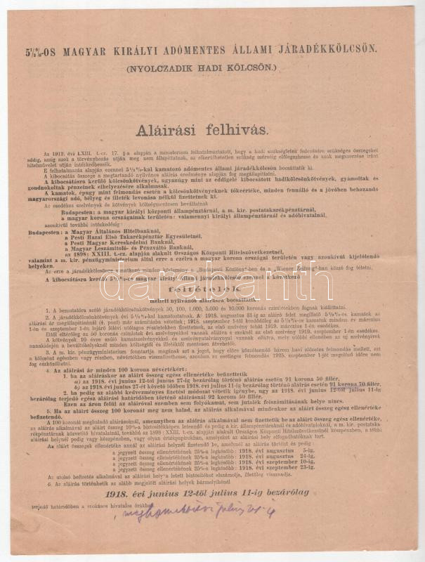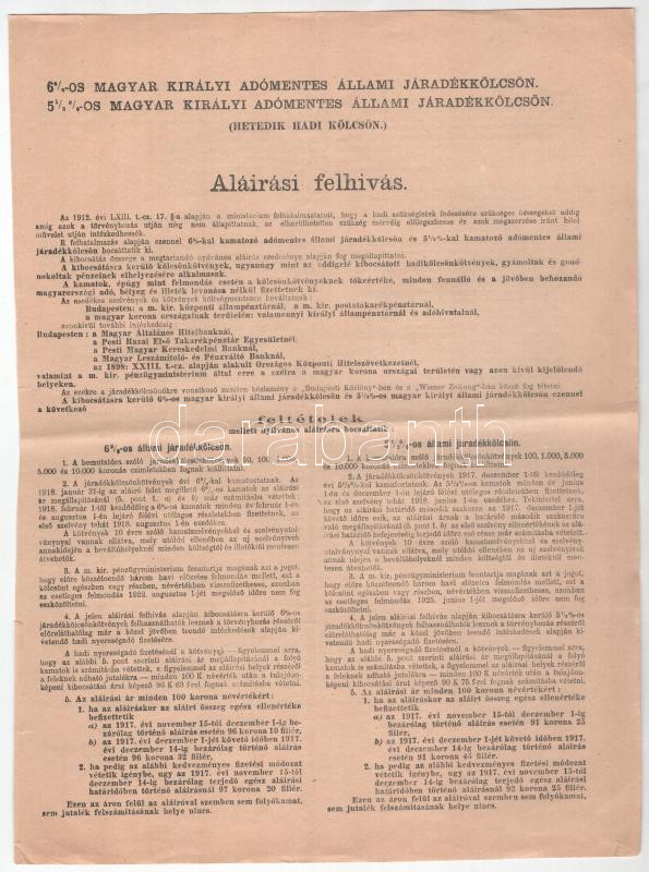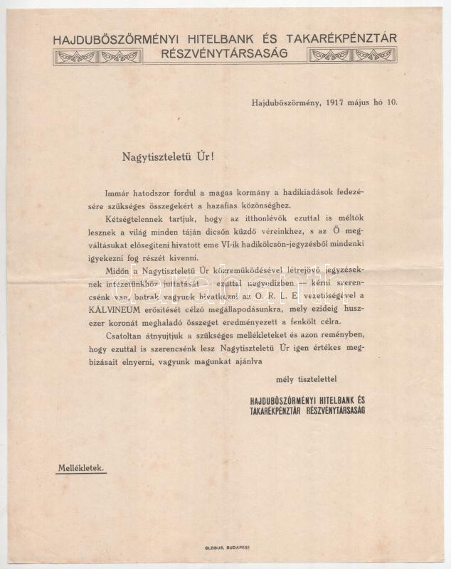 1917. Aláírási felhívás a hetedik, illetve a nyolcadik hadikölcsönhöz (Magyar Királyi Adómentes Állami Járadékkölcsön), illetve ehhez kapcsolódó levél a Hajdúböszörményi Hitelbank és Takarékpénztár Részvénytársaságtól