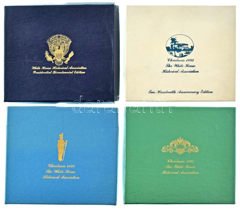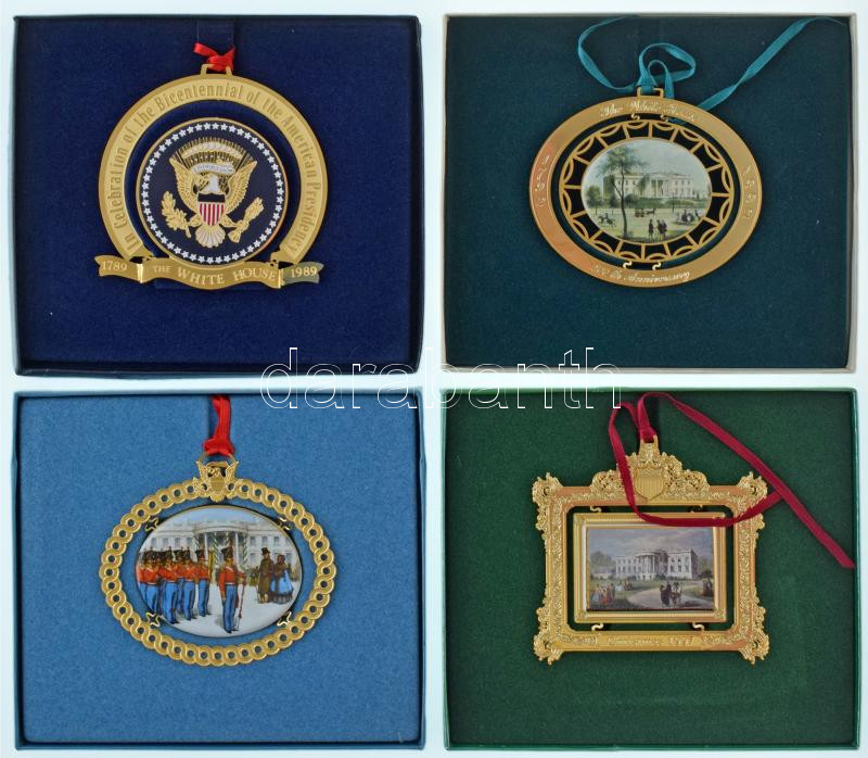 Amerikai Egyesült Államok 1989-1997. "A Fehér ház" (4xklf) részben műgyantás fém karácsonyfadíszek felakasztható szalagon, eredeti "The White House Historical Association" feliratú dísztokokban, angol nyelvű tájékoztatókkal. A díszek új állapotban, az egyik tok kissé viseltes.