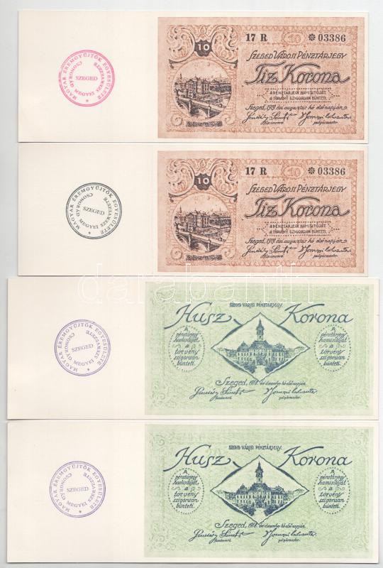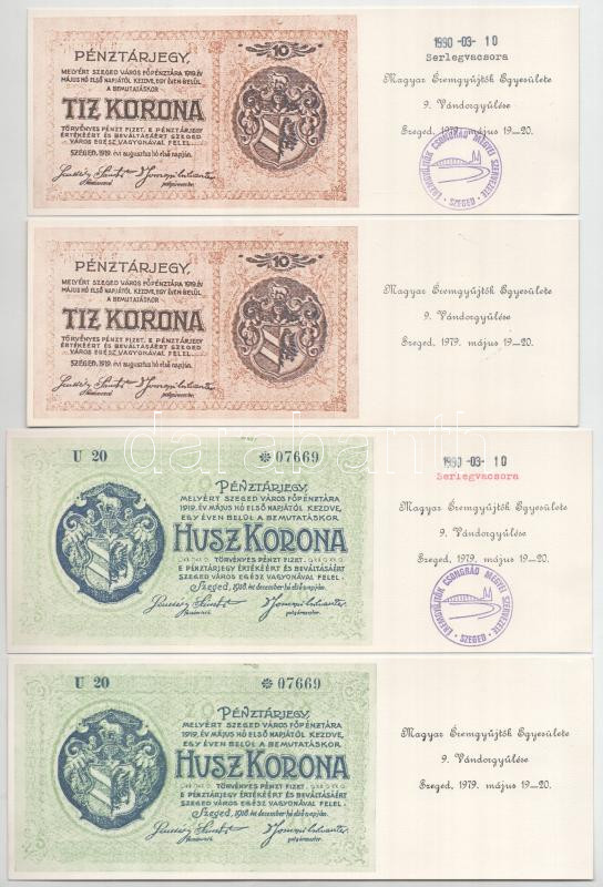 Szeged 1979. Az 1919-es 10K és 20K városi szükségpénz mintájára készült MÉE meghívó "A Magyar Éremgyűjtők Egyesülete 9. Vándorgyűlése - Szeged, 1979. május 19-20." szöveggel, hátoldalán "MÉE Csongrád megyei szervezete, Szeged" bélyegzéssel (2xklf) + Az 1919-es 10K és 20K városi szükségpénz mintájára készült MÉE meghívó "A Magyar Éremgyűjtők Egyesülete 9. Vándorgyűlése - Szeged, 1979. május 19-20." szöveggel, "1990-03-10 - Serlegvacsora" és "Éremgyűjtők Csongrád Megyei Szervezete - Szeged" bélyegzésekkel, hátoldalán "MÉE Csongrád megyei szervezete, Szeged" bélyegzéssel (2xklf) T:UNC