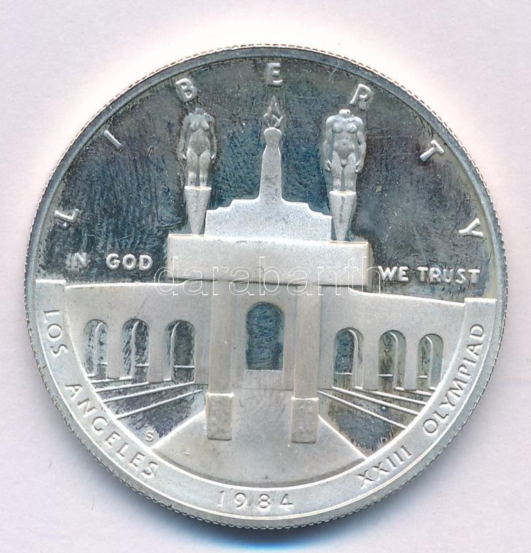 Amerikai Egyesült Államok 1984S 1$ Ag "XXIII. Nyári Olimpiai - Los Angeles" T:UNC (eredetileg PP) patina, folt USA 1984S 1 Dollar Ag "23th Summer Olympics - Los Angeles" C:UNC (originally PP) patina, spotted Krause KM#210