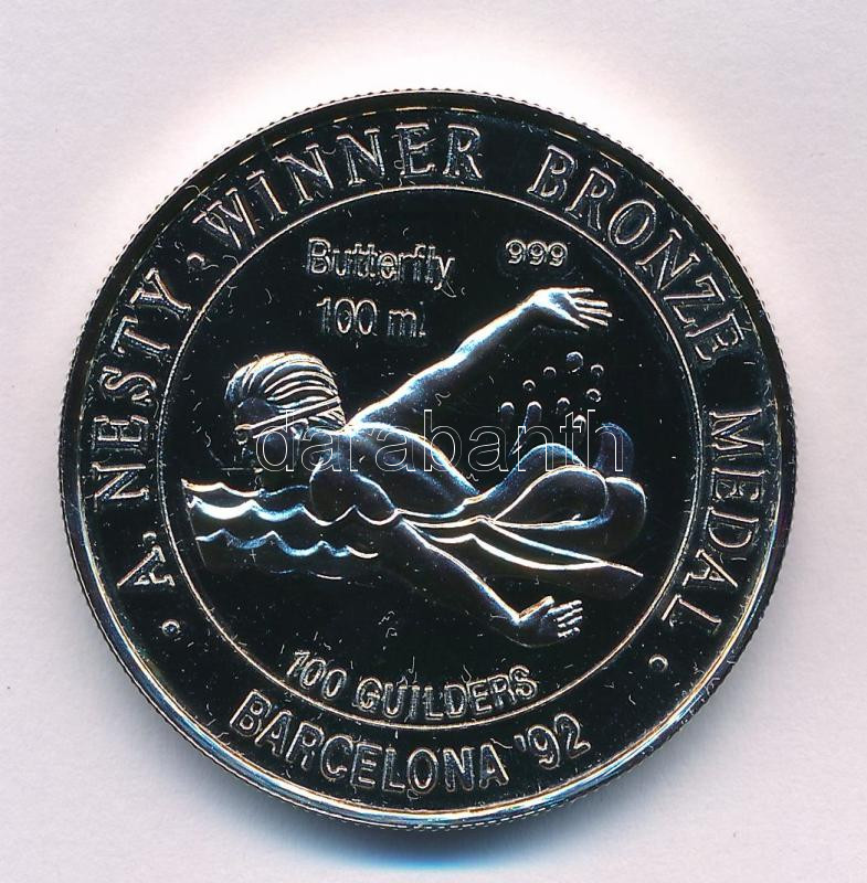 Suriname 1992. 100G Ag "Anthony Nesty bronzérme 100 méteres pillangóúszásban az 1992-es Olimpián" T:PP Suriname 1992. 100 Guilders Ag "Bronze Medal 100m Butterfly for Anthony Nesty on 1992 Olympic Games" C:PP Krause KM#42.1a