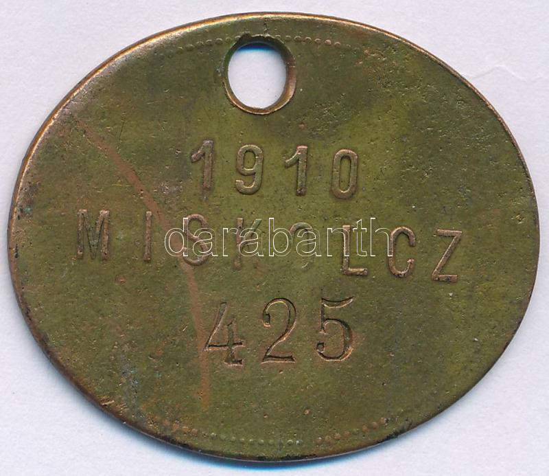 Leírás: 1910. "Miskolcz" bronz ebadójegy / kutyabárca, "425" sorszámmal (40x34mm) T:XF