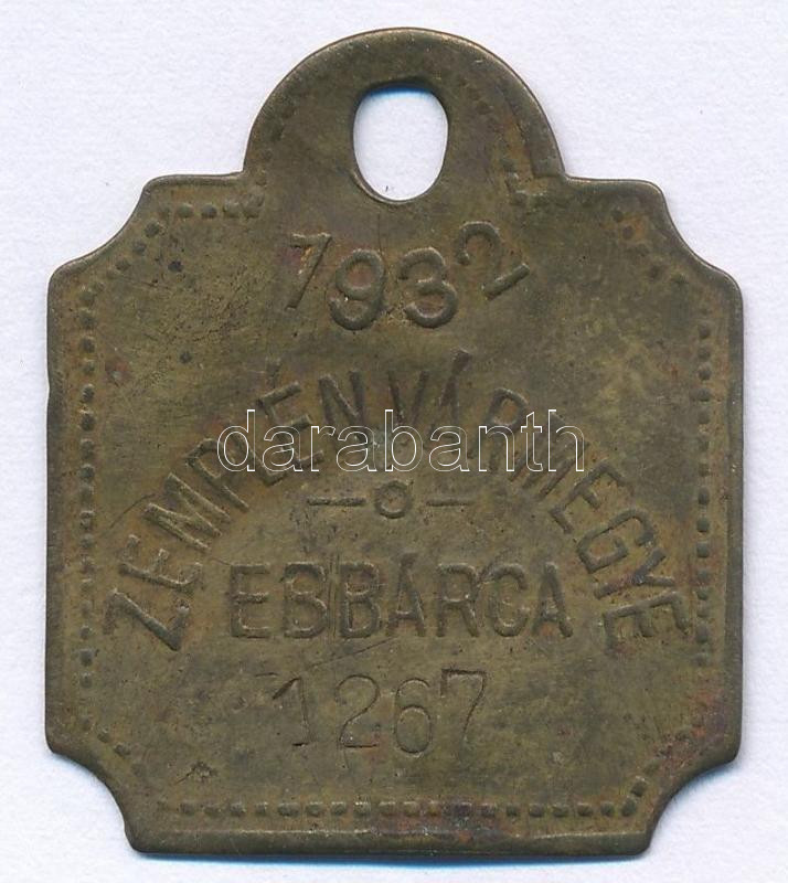 1932. "Zemplén vármegye" bronz ebadójegy / kutyabárca, "... https://www.darabanth.com/hu/472-Gyorsarveres/472.0/Numizmatika/Papir-es-fem-szuksegpenzek~2000007/1932-Zemplen-varmegye-bronz-ebadojegy-kutyabarca-1267-sorszammal-35x30mm-TXF-VF~II3201748