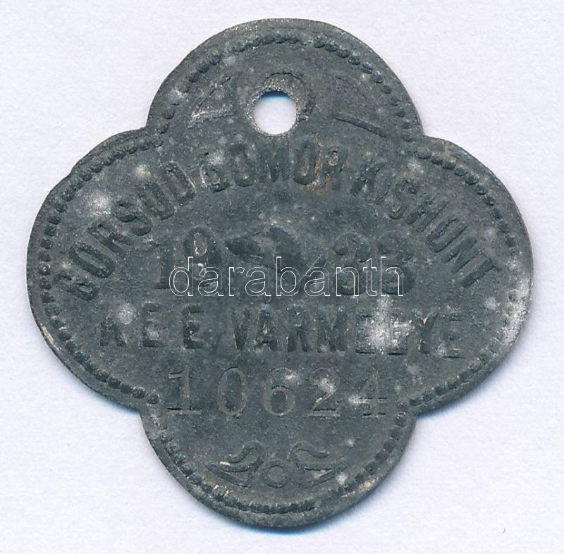 Leírás: 1933. "Borsod, Gömör és Kishont Vármegye" Zn ebadójegy / kutyabárca, "10624" sorszámmal (33x33mm) T:XF oxidáció