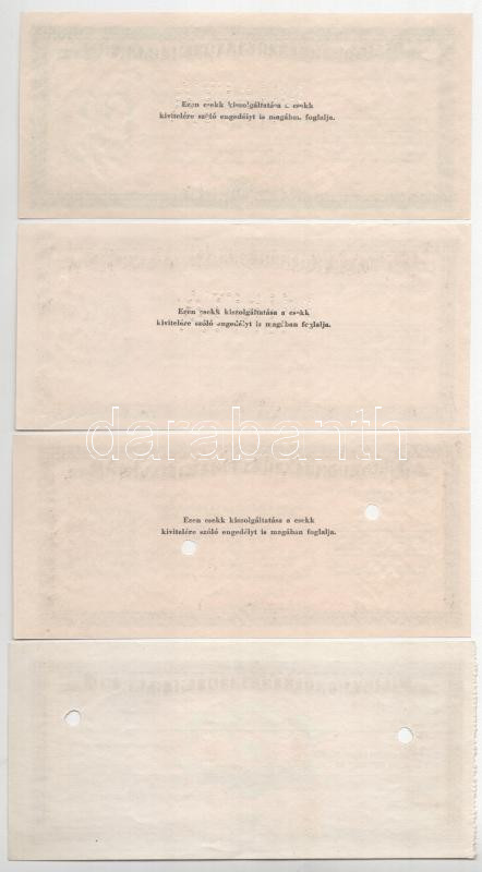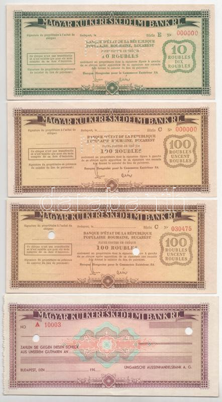 Leírás: ~1950. "Magyar Külkereskedelmi Bank" kitöltetlen csekk, lyukasztással érvénytelenítve + DN 10R "Magyar Külkereskedelmi Bank" csekk "MINTA" perforációval és "000000" sorszámmal + 100R "Magyar Külkereskedelmi Bank" csekk "MINTA" perforációval és "000000" sorszámmal + 100R "Magyar Külkereskedelmi Bank" kitöltetlen csekk, lyukasztással érvénytelenítve T:AU,XF