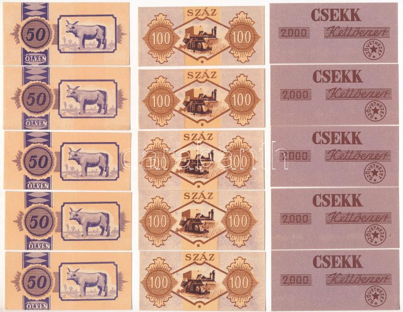 Leírás: ~1970-1980. "50" (5x) + "100" (5x) + "Csekk 2000 Szövetkezet" (5x) játékpénzek T:AU