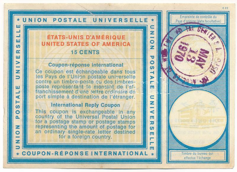 Amerikai Egyesült Államok 1970. 15c "UPU Nemzetközi Válaszdíjszelvény" vízjeles papíron, pecséttel T:XF USA 1970. 15 Cents "International Reply Coupon" on watermarked paper, with stamp C:XF