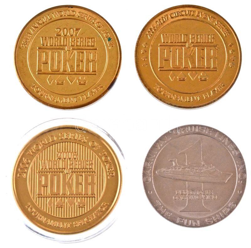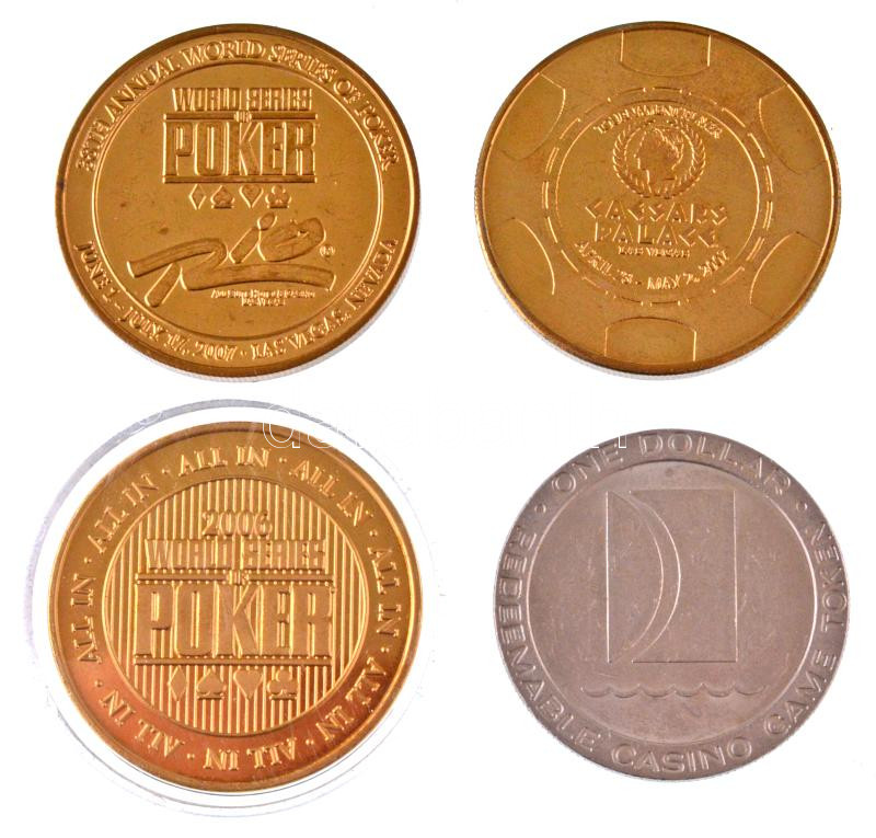 Leírás: Amerikai Egyesült Államok DN 1$ fém kaszinózseton + 2006-2007. "World Series of Poker" kétoldalas, aranyozott fém emlékérmek (3xklf) ebből 2db játékosnak (Tournament Player), 1db nézőnek (Tournament Spectator) feliratozva, egyikhez tanúsítvány T:UNC-VF