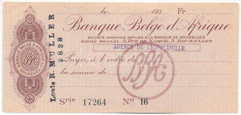 Leírás: Belgium / Brüsszel ~1930. "Banque Belge d'Afrique sa Bruxelles" kitöltetlen csekkje, "Agence de Leopoldville" bélyegzéssel T:F