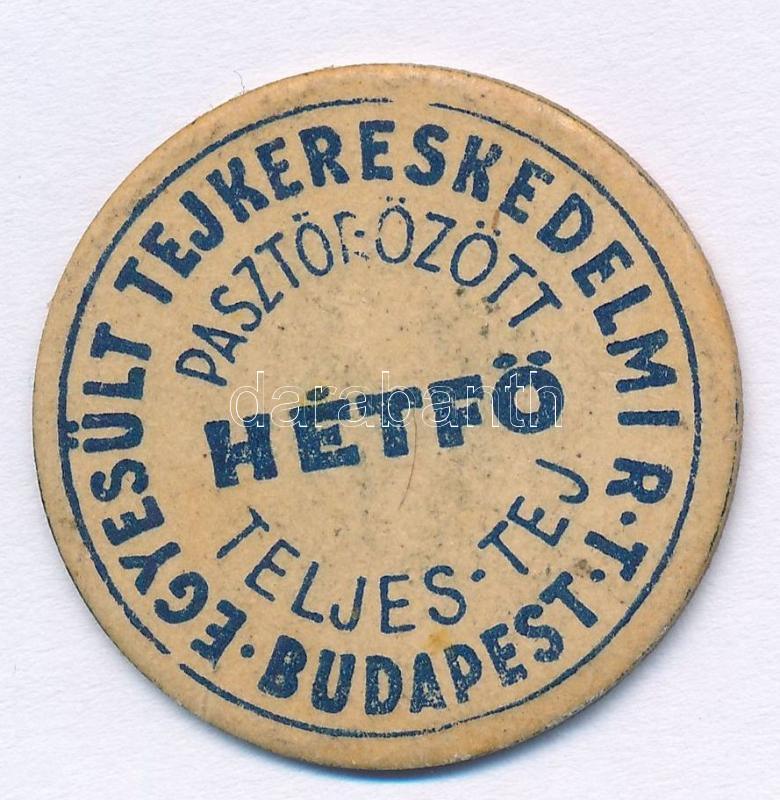 Budapest ~1920. "Egyesült Tejkereskedelmi R.T. - Budapest - Pasztőrözött teljes tej - Hétfő" meghatározott napra szóló, karton tejipari bárca (39mm) T:AU