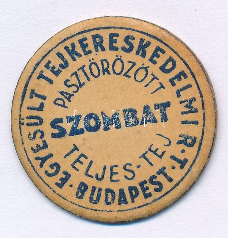 Budapest ~1920. "Egyesült Tejkereskedelmi R.T. - Budapest - Pasztőrözött teljes tej - Szombat" meghatározott napra szóló, karton tejipari bárca (39mm) T:AU