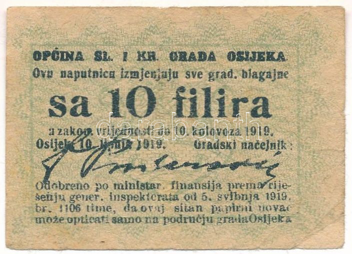 Osijek 1919. June 10 Filira C:F,VG https://www.darabanth.com/hu/472-Gyorsarveres/472.0/Numizmatika/Papir-es-fem-szuksegpenzek~2000007/Eszek-1919-junius-10f-TF-VG-Osijek-1919-June-10-Filira-CF-VG~II3195053