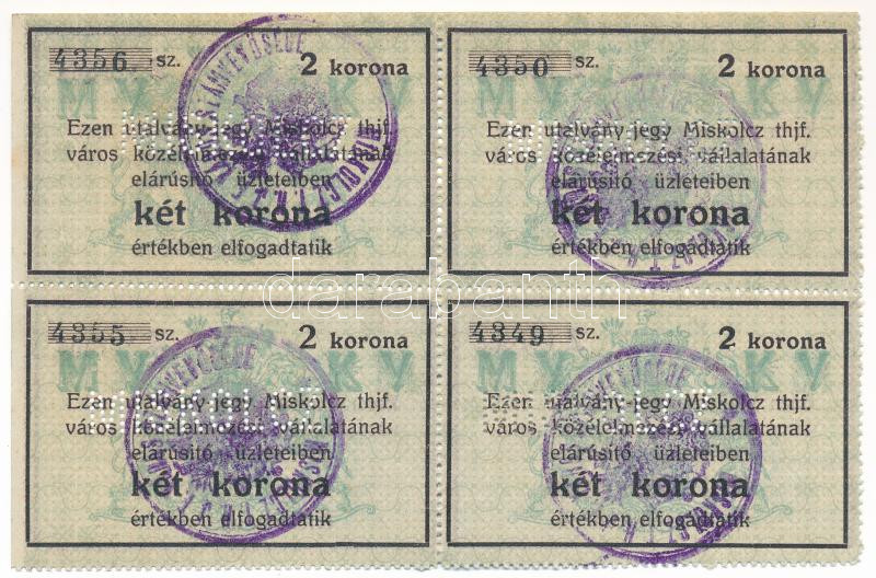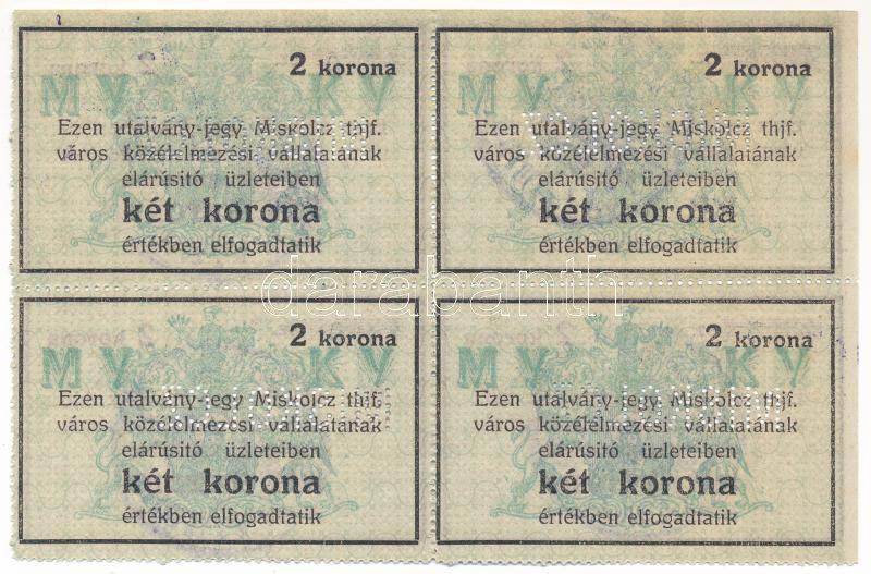 Leírás: Miskolc ~1918-1919. 2K "Miskolcz thjf." utalvány-jegy négyes ívben, mind "MISKOLCZ" perforációval, bélyegzéssel T:AU Adamo MIS-4.4o