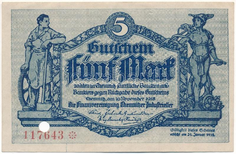 Leírás: Német Birodalom / Chemnitz / 1918. 5M "Chemnitzi Gyáriparosok Pénzügyi Szövetsége" lyukasztással érvénytelenítve T:XF