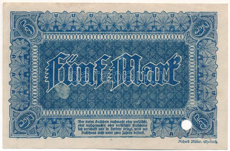 Germany / Chemnitz 1918. 5 Mark "Finanzvereinigung Chemnitzer Industrieller" invalidated by hole C:XF