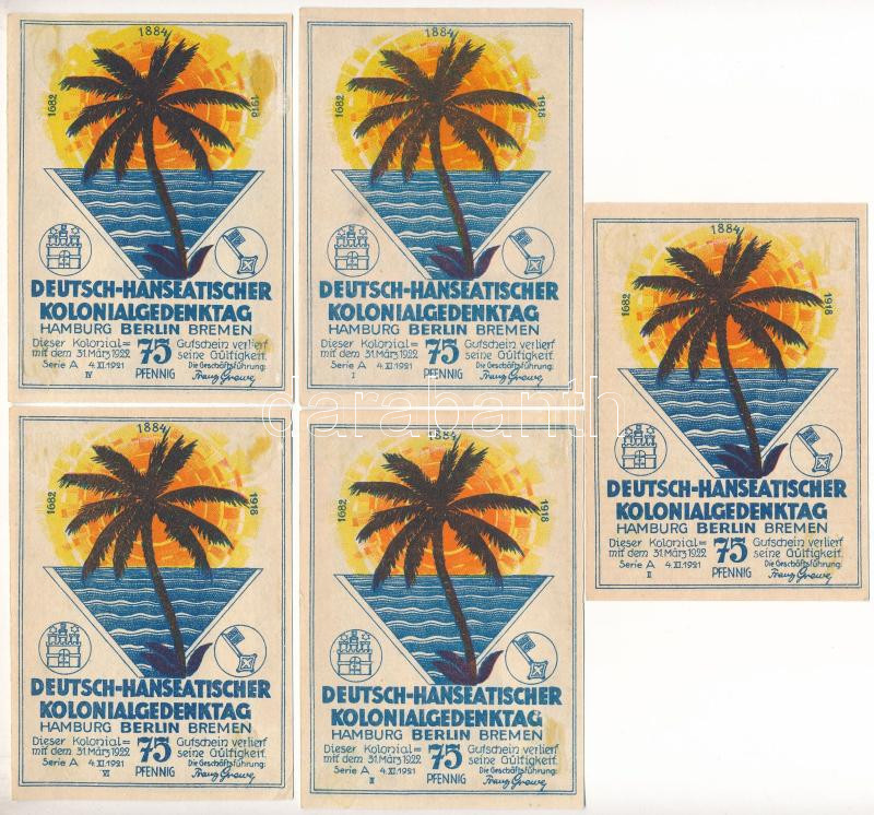 Leírás: Németország / Weimari Köztársaság / Berlin 1921. 75pf szükségpénz "A német-hanza gyarmati emléknapja" A-sorozat (5xklf) T:UNC,AU