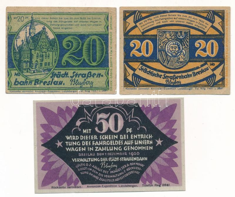 Leírás: Németország / Weimari Köztársaság / Breslau (Wroclaw) 1920-1922. 20pf + 50pf "Breslaui Városi Villamos" (3xklf) T:VF,F Germany / Weimar Republic / Breslau (Wroclaw) 1920-1922. 20 Pfennig - 50 Pfennig "Stästische Straßenbahn Breslau" (3xdiff) C:VF,F
