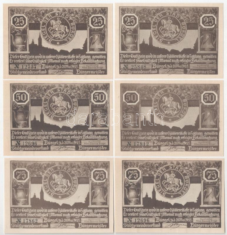 Németország / Weimari Köztársaság / Bürgel 1921. 25pf-75pf (6xklf) T:U... https://www.darabanth.com/hu/472-Gyorsarveres/472.0/Numizmatika/Papir-es-fem-szuksegpenzek~2000007/Nemetorszag-Weimari-Koztarsasag-Burgel-1921-25pf-75pf-6xklf-TUNC-AU-Germany-Weimar-~II3198381