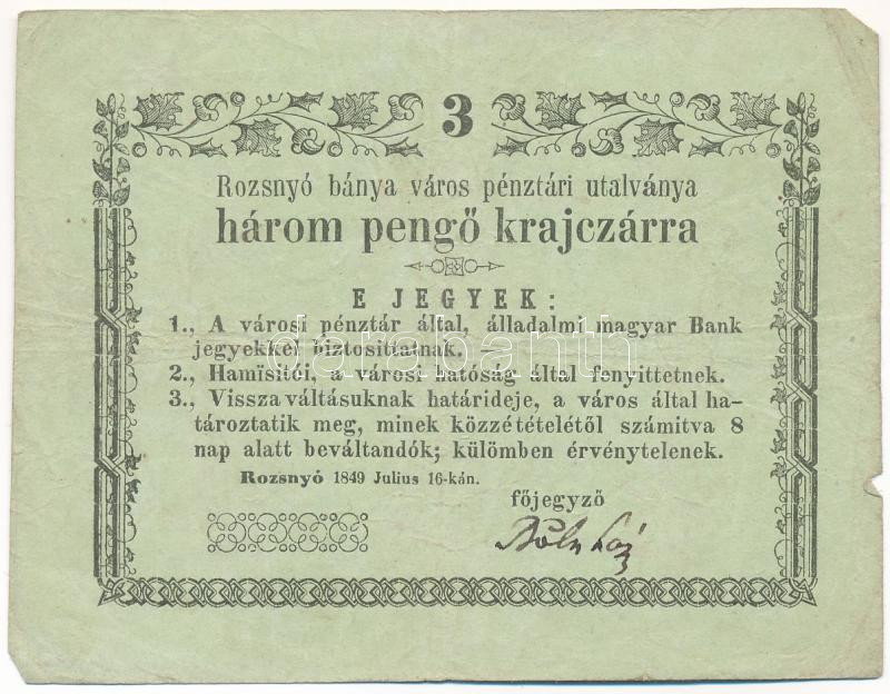 Rozsnyó 1849. július 16. 3kr "Rozsnyó bánya város pénztári utalvá... https://www.darabanth.com/hu/472-Gyorsarveres/472.0/Numizmatika/Papir-es-fem-szuksegpenzek~2000007/Rozsnyo-1849-julius-16-3kr-Rozsnyo-banya-varos-penztari-utalvanya-TF-Hungary-Rozsnyo~II3161244