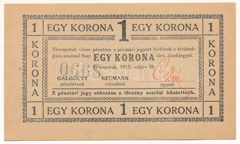 Leírás: Sárospatak 1919. 1K hátlapon bélyegzővel, aláírással, "0668" sorszámmal T:AU